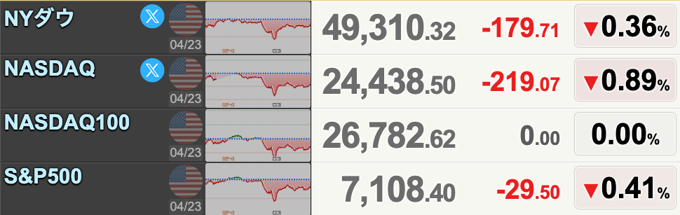 ダウ平均は205ドル安の49,284ドルでスタートし、24時頃には高値をつけました。その後は下落し、少し回復したものの179ドル安の49,310で大引けとなりました。S&P500は29ポイント安の7,108、ナスダックは219ポイント安の24,438で引けています。