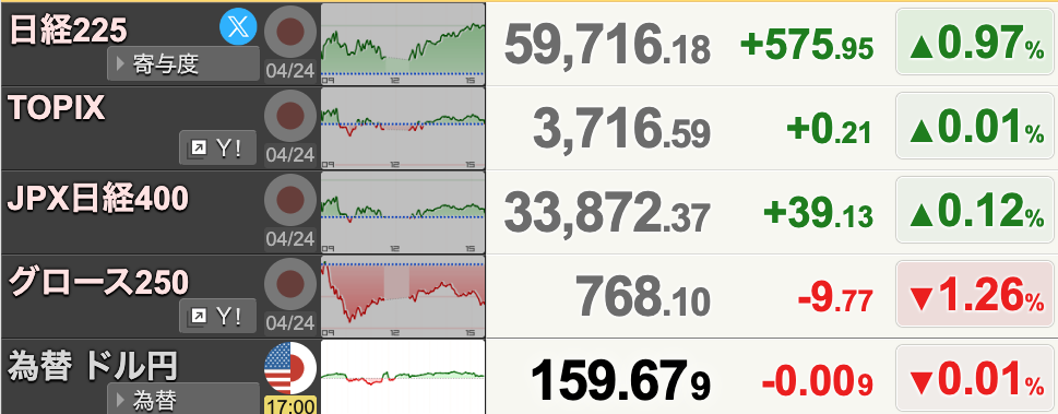 今日も寄り付きからAI・半導体中心に強い流れになりました。前日の米国株安という逆風を無視する形で日経平均は2日ぶりに史上最高値を更新して引けました。575円高の59,716円で大引けです。