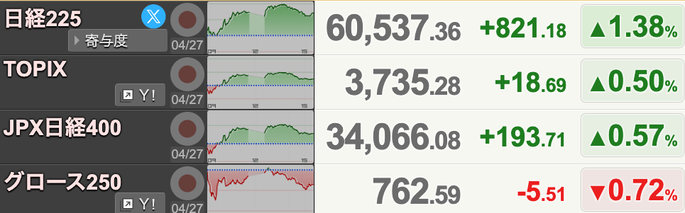 その後は少し失速しましたが、最終的には821円高の60,537円で大引けに。初の6万円を超えて取引を終えました。TOPIXは18ポイント高の3,735と続伸しています。