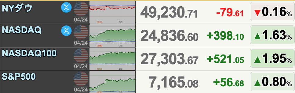 ダウが下落し、S&Pとナスダックは上昇しましたが、イランとの和平協議の停滞や、週末に起きた発砲事件などネガティブ情報も多いです。