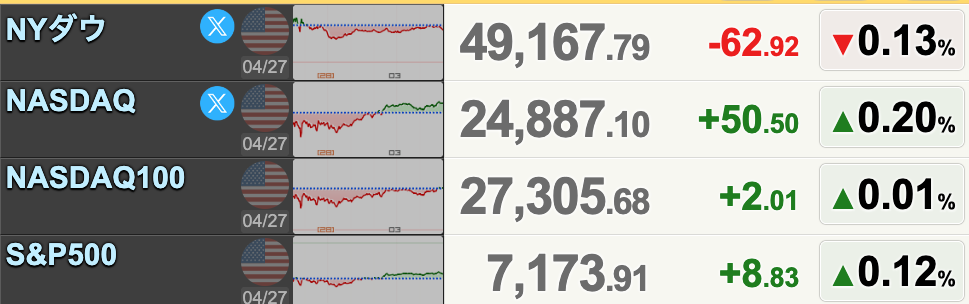 ダウ平均は上値が重く、早々に49,000ドルまで売られましたが、最終的には62ドル安の49,167ドルで取引を終えています。ナスダックは50ポイント高の24,887、S&P500は8ポイント高の7,173で、いずれも最高値を更新しました。