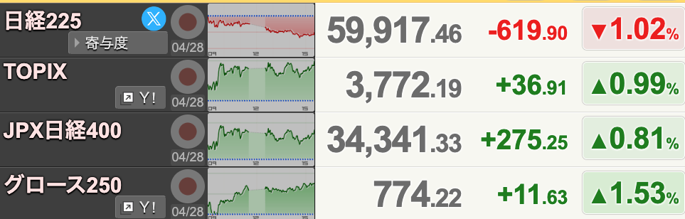 日経平均は最終的に619円安の59,917円で引けて、3日ぶりの反落となりました。TOPIXは36ポイント高の3,772で3日続伸、グロース250は11ポイント高の774でした。